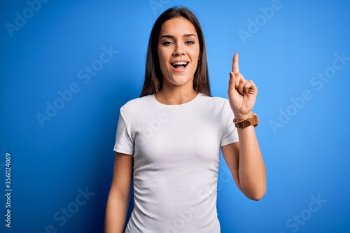 Young beautiful brunette woman wearing white casual t-shirt standing over blue background pointing finger up with successful idea. Exited and happy. Number one.