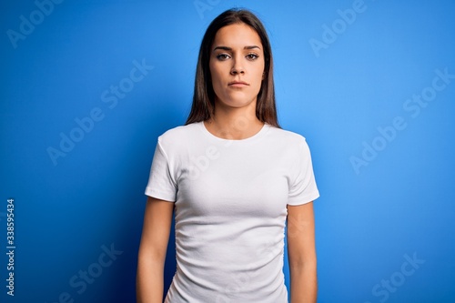 Young beautiful brunette woman wearing white casual t-shirt standing over blue background with serious expression on face. Simple and natural looking at the camera.