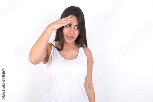 Young beautiful brunette woman wearing white top over white wall touching forehead, hears something surprising, glad receive good news, feels relieved. Almost got in trouble.