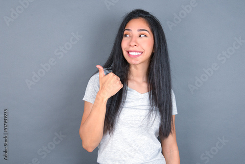 young beautiful brunette woman wearing white t-shirt over grey background points away and gives advice demonstrates advertisement