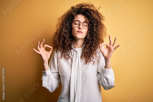 Young beautiful brunette woman with curly hair and piercing wearing shirt and glasses relax and smiling with eyes closed doing meditation gesture with fingers. Yoga concept.
