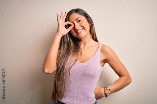 Young beautiful brunette woman with long hair standing over isolated background doing ok gesture with hand smiling, eye looking through fingers with happy face.