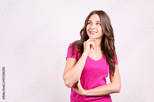 Young beautiful brunette woman with long wavy hair wearing pink shirt, posing over white isolated background. Portrait of female model showing gestures and emotions. Close up, copy space.