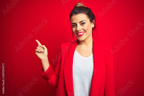 Young beautiful business woman standing over red isolated background cheerful with a smile on face pointing with hand and finger up to the side with happy and natural expression