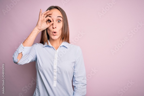 Young beautiful businesswoman wearing elegant shirt standing over isolated pink background doing ok gesture shocked with surprised face, eye looking through fingers. Unbelieving expression.