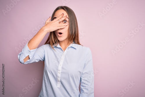 Young beautiful businesswoman wearing elegant shirt standing over isolated pink background peeking in shock covering face and eyes with hand, looking through fingers with embarrassed expression.