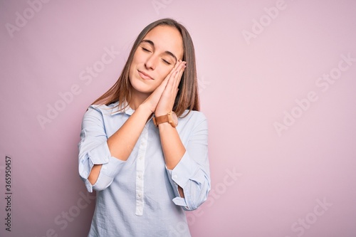 Young beautiful businesswoman wearing elegant shirt standing over isolated pink background sleeping tired dreaming and posing with hands together while smiling with closed eyes.