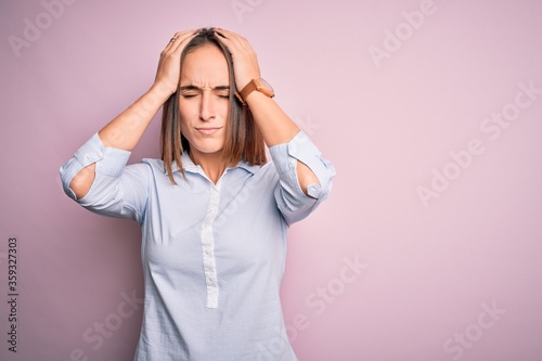 Young beautiful businesswoman wearing elegant shirt standing over isolated pink background suffering from headache desperate and stressed because pain and migraine. Hands on head.