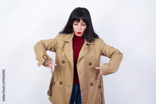 Young beautiful caucasian businesswoman standing against white background, being surprised and pointing down,