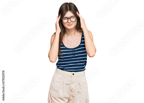 Young beautiful caucasian girl wearing casual clothes and glasses with hand on head for pain in head because stress. suffering migraine.