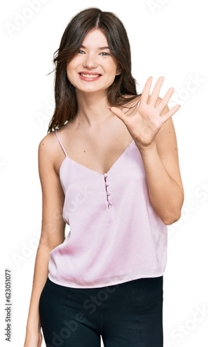 Young beautiful caucasian girl wearing casual clothes showing and pointing up with fingers number five while smiling confident and happy.
