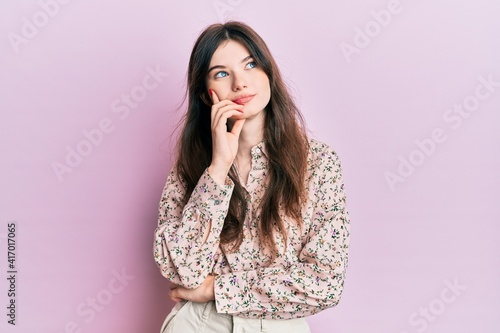 Young beautiful caucasian girl wearing elegant clothes serious face thinking about question with hand on chin, thoughtful about confusing idea