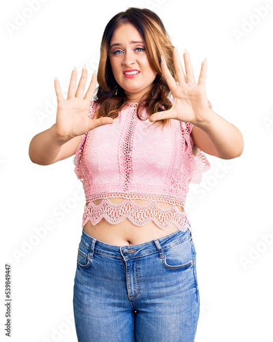 Young beautiful caucasian woman wearing casual clothes afraid and terrified with fear expression stop gesture with hands, shouting in shock. panic concept.