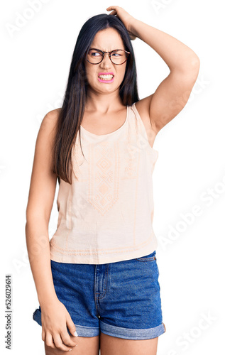 Young beautiful caucasian woman wearing casual clothes and glasses confuse and wonder about question. uncertain with doubt, thinking with hand on head. pensive concept.