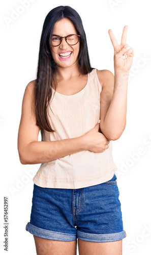 Young beautiful caucasian woman wearing casual clothes and glasses smiling with happy face winking at the camera doing victory sign. number two.