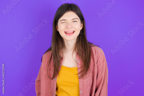 young beautiful Caucasian woman wearing casual clothes over purple wall blinking eyes with pleasure having happy expression. Facial expressions and people emotions concept.