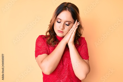 Young beautiful caucasian woman wearing casual clothes sleeping tired dreaming and posing with hands together while smiling with closed eyes.