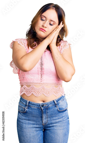 Young beautiful caucasian woman wearing casual clothes sleeping tired dreaming and posing with hands together while smiling with closed eyes.