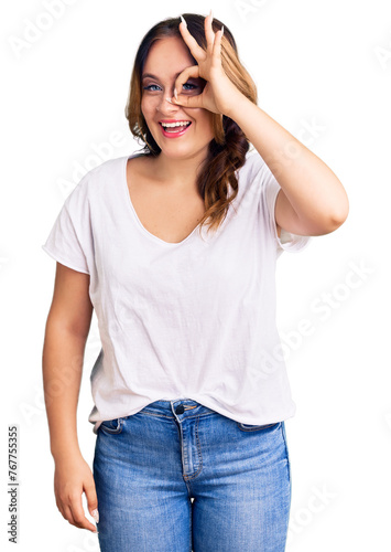 Young beautiful caucasian woman wearing casual white tshirt doing ok gesture with hand smiling, eye looking through fingers with happy face.