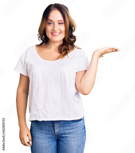 Young beautiful caucasian woman wearing casual white tshirt smiling cheerful presenting and pointing with palm of hand looking at the camera.