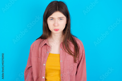 young beautiful Caucasian woman wearing pink jacket over blue wall crying desperate and depressed with tears on his eyes suffering pain and depression. Sad facial expression and emotion concept.