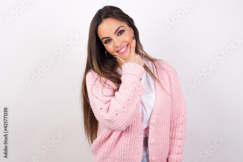 young beautiful caucasian woman wearing pink knitted jacket over white wall looking confident at the camera smiling with crossed arms and hand raised on chin. Thinking positive.