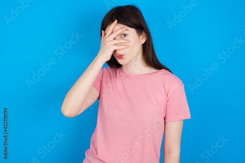young beautiful Caucasian woman wearing pink T-shirt over blue wall peeking in shock covering face and eyes with hand, looking through fingers with embarrassed expression.