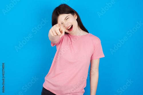 young beautiful Caucasian woman wearing pink T-shirt over blue wall pointing displeased and frustrated to the camera, angry and furious ready to fight with you.