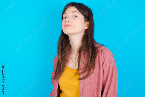 young beautiful Caucasian woman wearing pink T-shirt over blue wall with snobbish expression curving lips and raising eyebrows, looking with doubtful and skeptical expression, suspect and doubt.