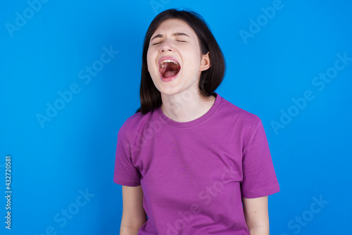 young beautiful Caucasian woman wearing purple T-shirt over blue wall angry and mad screaming frustrated and furious, shouting with anger. Rage and aggressive concept.