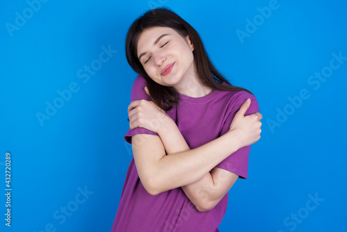 young beautiful Caucasian woman wearing purple T-shirt over blue wall Hugging oneself happy and positive, smiling confident. Self love and self care