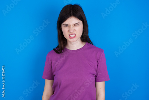 young beautiful Caucasian woman wearing purple T-shirt over blue wall keeps teeth clenched, frowns face in dissatisfaction, irritated because of much duties.