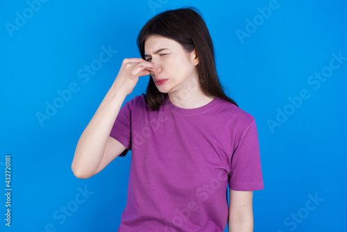 young beautiful Caucasian woman wearing purple T-shirt over blue wall smelling something stinky and disgusting, intolerable smell, holding breath with fingers on nose. Bad smell