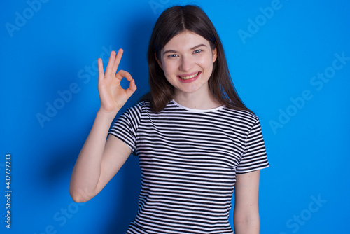 young beautiful Caucasian woman wearing stripped T-shirt over blue wall hold hand arm okey symbol toothy approve advising novelty news