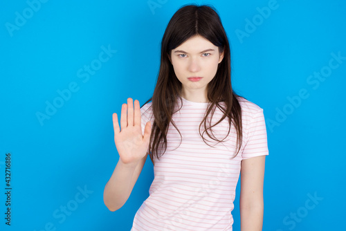 young beautiful Caucasian woman wearing stripped T-shirt over blue wall shows stop sign prohibition symbol keeps palm forward to camera with strict expression