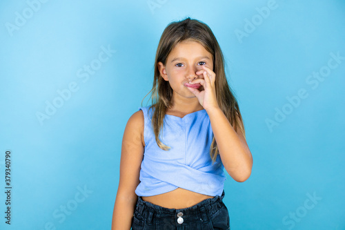Young beautiful child girl over isolated blue background mouth and lips shut as zip with fingers. Secret and silent, taboo talking