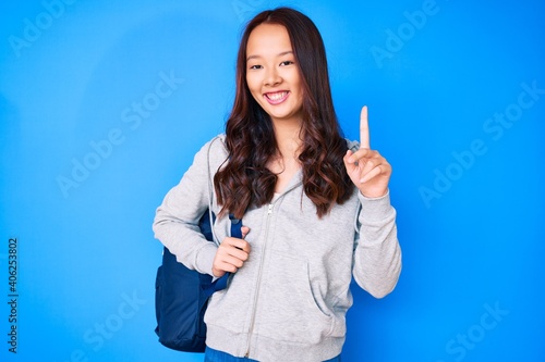 Young beautiful chinese girl holding student backpack surprised with an idea or question pointing finger with happy face, number one