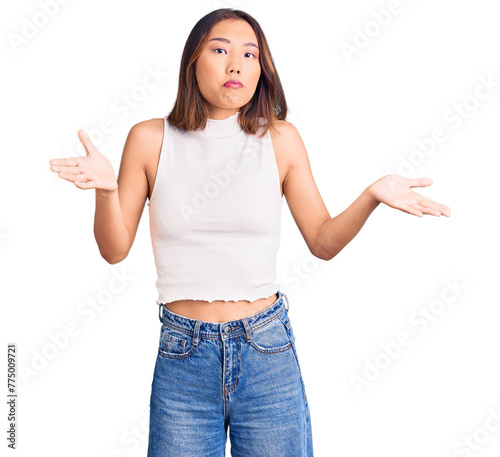 Young beautiful chinese girl wearing casual clothes clueless and confused expression with arms and hands raised. doubt concept.