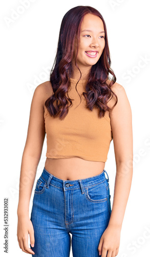 Young beautiful chinese girl wearing casual clothes looking away to side with smile on face, natural expression. laughing confident.