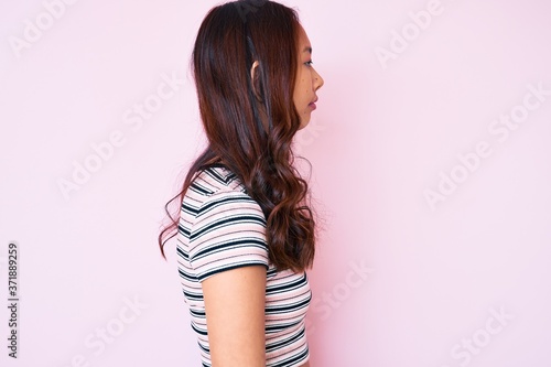 Young beautiful chinese girl wearing casual clothes looking to side, relax profile pose with natural face with confident smile.