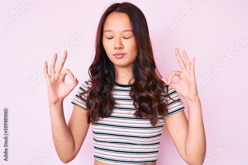Young beautiful chinese girl wearing casual clothes relax and smiling with eyes closed doing meditation gesture with fingers. yoga concept.