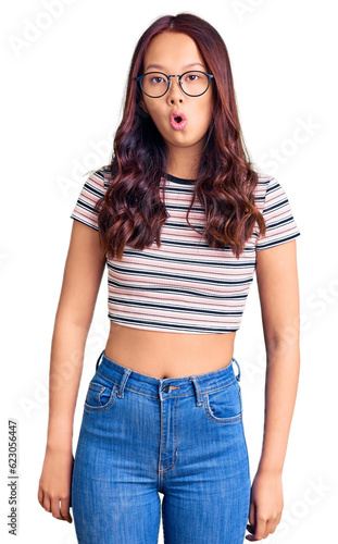 Young beautiful chinese girl wearing casual clothes scared and amazed with open mouth for surprise, disbelief face