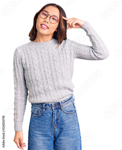 Young beautiful chinese girl wearing casual clothes smiling pointing to head with one finger, great idea or thought, good memory