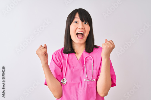 Young beautiful Chinese nurse woman wearing stethoscope over isolated white background celebrating surprised and amazed for success with arms raised and open eyes. Winner concept.