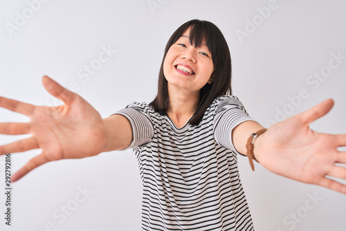 Young beautiful chinese woman wearing black striped t-shirt over isolated white background looking at the camera smiling with open arms for hug. Cheerful expression embracing happiness.