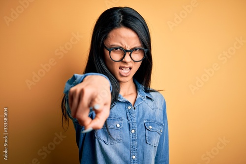 Young beautiful chinese woman wearing casual denim shirt over isolated yellow background pointing displeased and frustrated to the camera, angry and furious with you