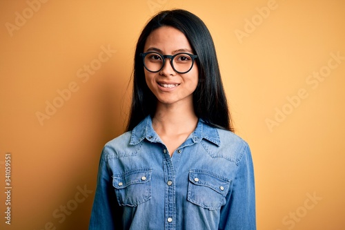 Young beautiful chinese woman wearing casual denim shirt over isolated yellow background with a happy and cool smile on face. Lucky person.