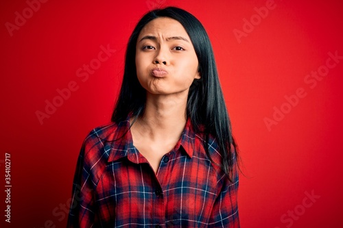 Young beautiful chinese woman wearing casual shirt over isolated red background puffing cheeks with funny face. Mouth inflated with air, crazy expression.