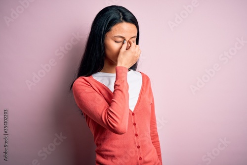 Young beautiful chinese woman wearing casual sweater over isolated pink background tired rubbing nose and eyes feeling fatigue and headache. Stress and frustration concept.