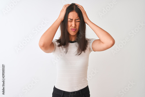 Young beautiful chinese woman wearing casual t-shirt standing over isolated white background suffering from headache desperate and stressed because pain and migraine. Hands on head.